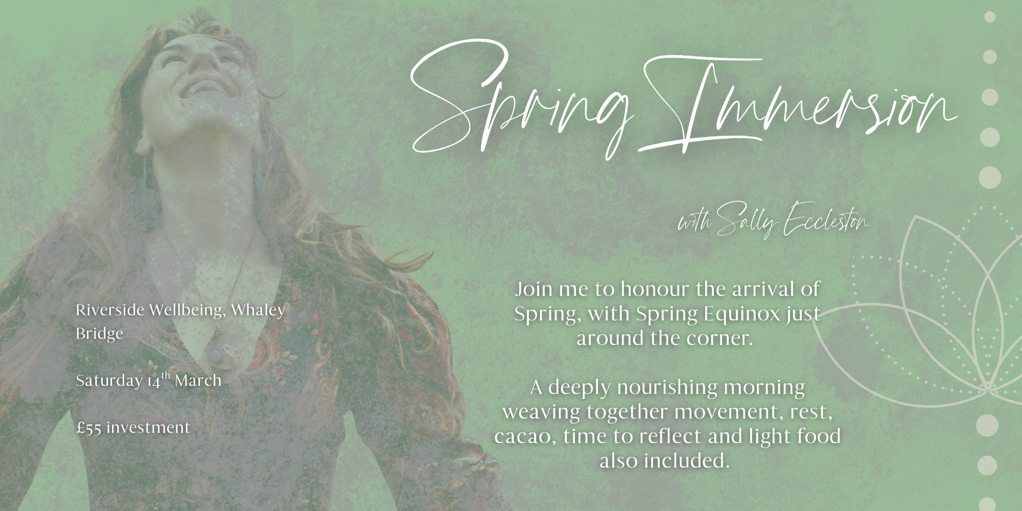 “I was fortunate to secure a place on Sally’s Spring Equinox Day Retreat in March 2024, and the experience was truly sublime. I’ve done a couple of other retreat events with Sally but you never know what she has in store for you! From the moment of arriving, I instantly felt at peace; the pretty location and light airy space, with gorgeous scents and music filling the room, accompanied by sounds of the river flowing by outside; every detail created a perfect idyll of relaxation and comfort. The day was arranged to include variety, a lot of warmth and joy, at times challenging in an enriching way, like a personal journey of self-rediscovery and release from unwanted strains and negativity. Our break for a delicious wholesome lunch added to the nourishing benefits of the day. The experience is wholly rejuvenating and beautiful in so many ways, a treat for the soul and senses, Sally’s retreat events are by far one of my most favourite days of the year. Thank you so much Sally for making this possible, you are a treasure I am so privileged to know!”